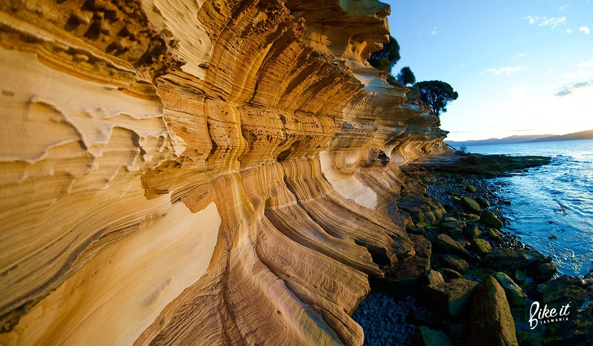 The Fossil Cliffs are found on the North-Eastern tip of the circuit on the waterline. The towering cliffs reaching nearly 100 metres high are home to some of the best-preserved fossils in Tasmania, despite thousands of years of weathering from wind and rain.