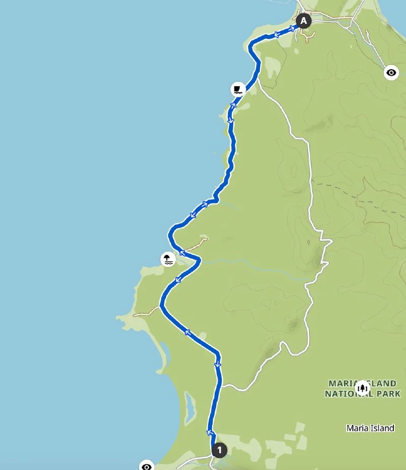 There is an optional side trip to Encampment Cove and Point Lesueur starting at the junction to French’s Farm. This road is mostly flat, and is slightly more challenging than the coastal road. Encampment cove and Point Lesueur are home to the Maria Island Convict Cells and carries with it a rich history.